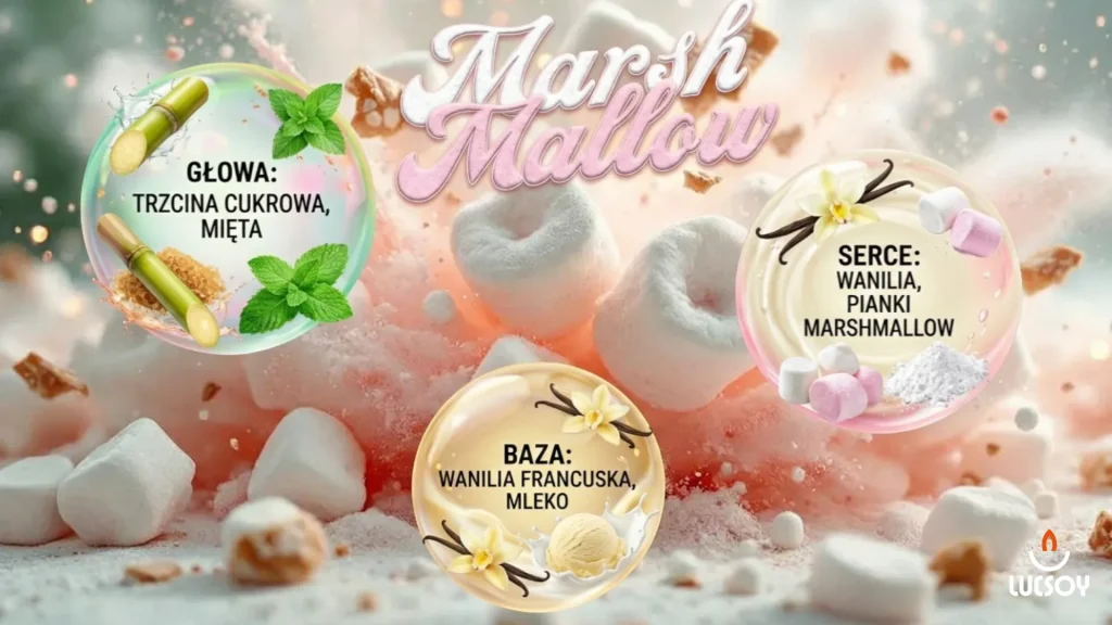 Nuty Serca (dusza zapachu): Absolutne, puszyste ukojenie. Ciepła Wanilia i miękkie, rozpływające się Pianki Marshmallow budują głęboki, beztroski nastrój.